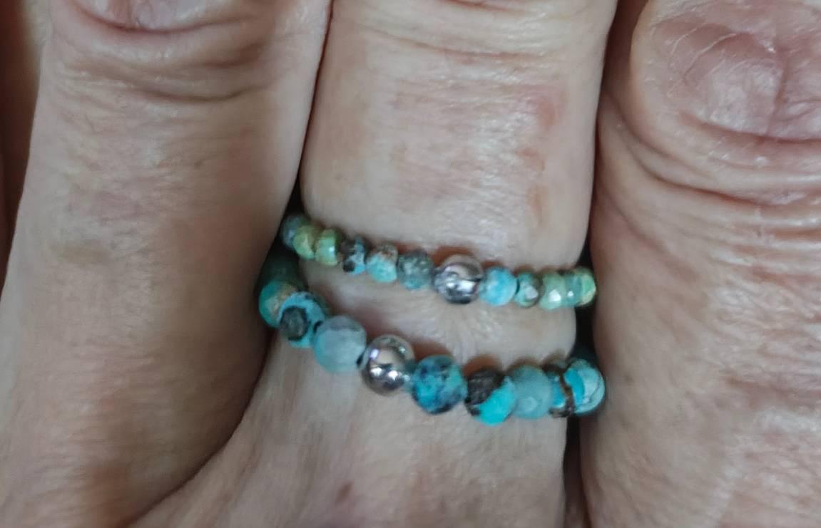 BEAUTIFUL TURQUOISE BEADED RING! WELL MADE WITH GOOD QUALITY TURQUOISE BEADS. SIZED PERFECTLY. EXACTLY AS DESCRIBED AND LOOKS BETTER IN PERSON THAN THE LISTING PHOTOS. My photo does not do justice to these rings. (The larger ring is the one that I purchased and the smaller ring was a GIFT!) Barbara (the shop owner) is such a pleasure to deal with. She replies to messages quickly. She is honest, professional, helpful and kind. ***FAST SHIPPING WITH SAFE SECURE AND LOVELY PACKAGING*** Thank you so much for the beautiful gift Barbara. I am touched and very grateful. I will be shopping here again soon. I HIGHLY RECOMMEND THIS RING AND THIS SHOP! 🙂